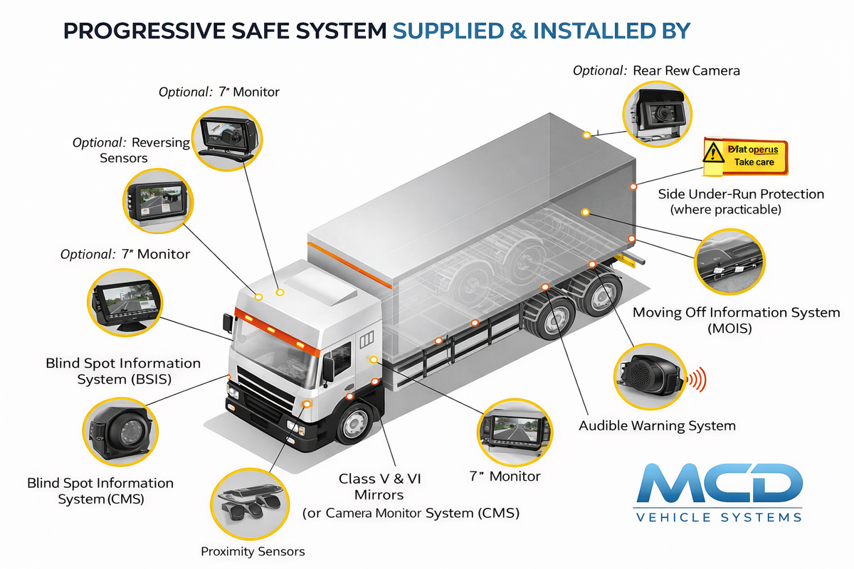 A compliant Progressive Safe System may include the following (vehicle dependent):